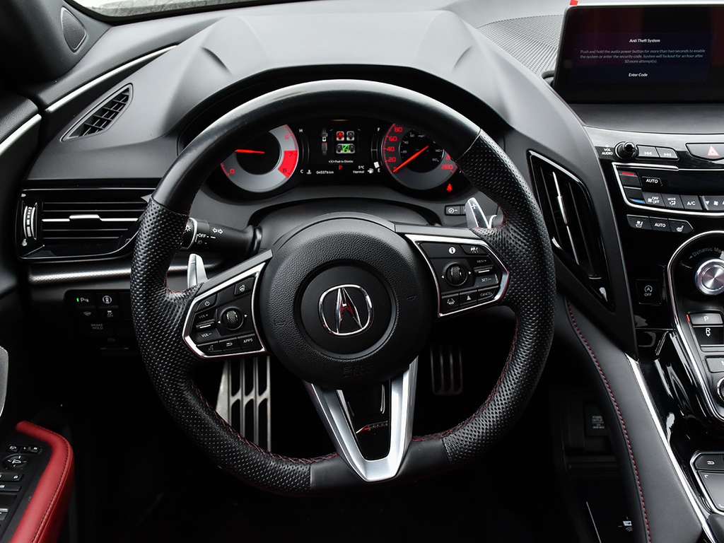 2023 Acura RDX A-spec. Acura Cerftified vehicle. 7 year 160,000 km warranty. A-Spec Exclusive Styling & Features The A-Spec trim focuses on a ''sport appearance'' both inside and out: Exterior: Gloss-black accents, dark chrome trim, LED fog lights, and 20-inch Shark Gray alloy wheels. Interior: Perforated Milano leather and Ultrasuede®-trimmed sport seats, a flat-bottom sport steering wheel, red ambient lighting, and metal sport pedals. Audio: Upgraded ELS Studio 3D® Premium Audio System with 16 speakers. Climate & Comfort: Heated and ventilated front seats are standard for this trim