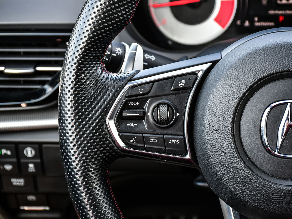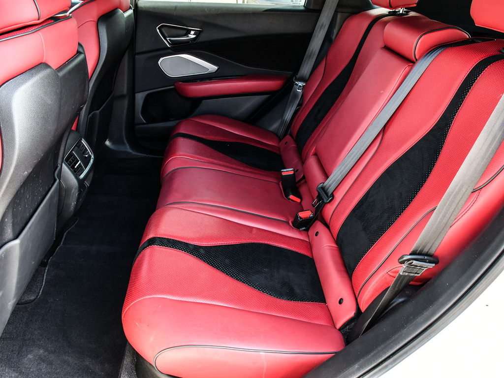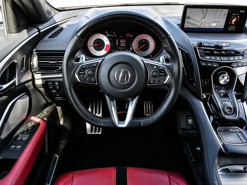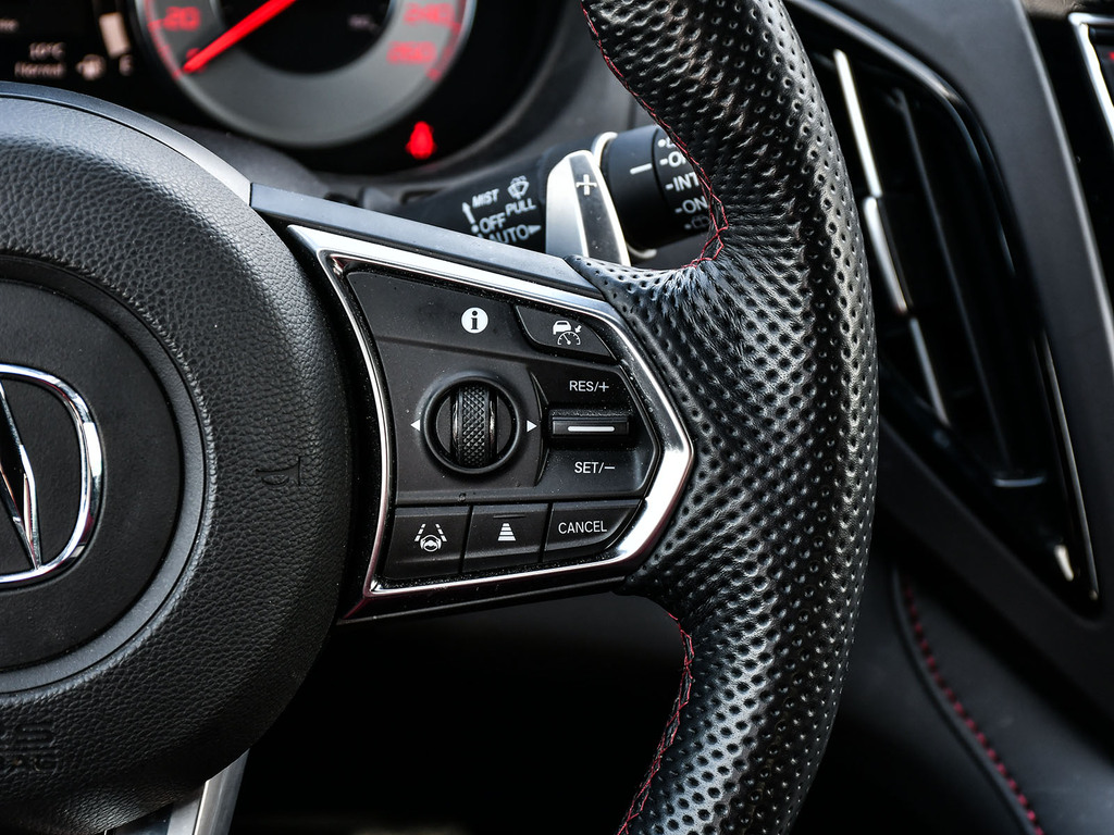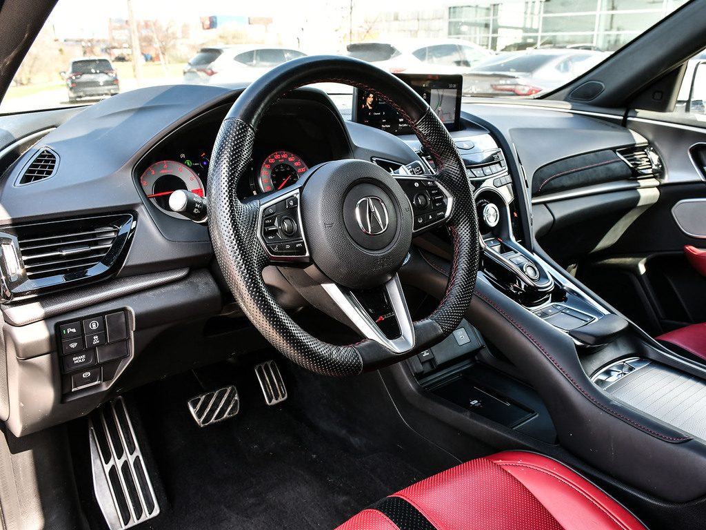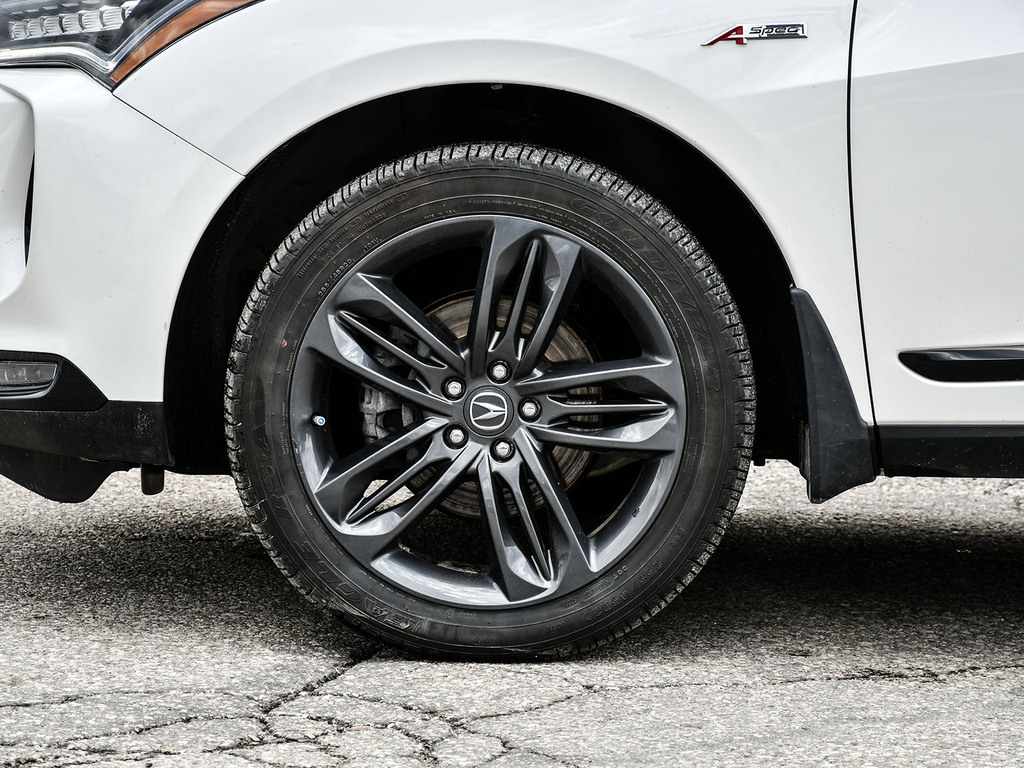 2023 Acura RDX A-spec. Acura Certified vehicle. 7 year 160,000 km warranty. Engine: 2.0L VTEC® turbocharged 4-cylinder engine. Power Output: Produces 272 horsepower at 6,500 rpm and 280 lb-ft of torque at 1,6004,500 rpm. Transmission: 10-speed automatic transmission with Sequential SportShift paddle shifters. Drivetrain: Standard Super Handling All-Wheel Drive (SH-AWD®) in Canada. The A-Spec trim focuses on a ''premium sportiness'' aesthetic both inside and out: Exterior: Features a gloss black Diamond Pentagon grille, black window trim, LED fog lights, and massive 4-inch dual exhaust finishers. It rides on 20-inch Shark Grey aluminum-alloy wheels. Interior: Includes a leather-wrapped flat-bottom sport steering wheel and seats finished in perforated Milano premium leather with Ultrasuede® inserts. Audio: Comes standard with the ELS Studio 3D® Premium Audio System featuring 16 speakers