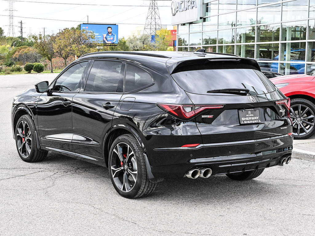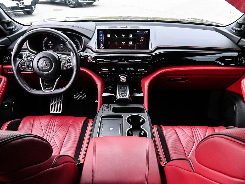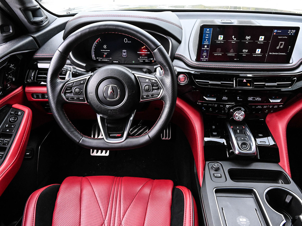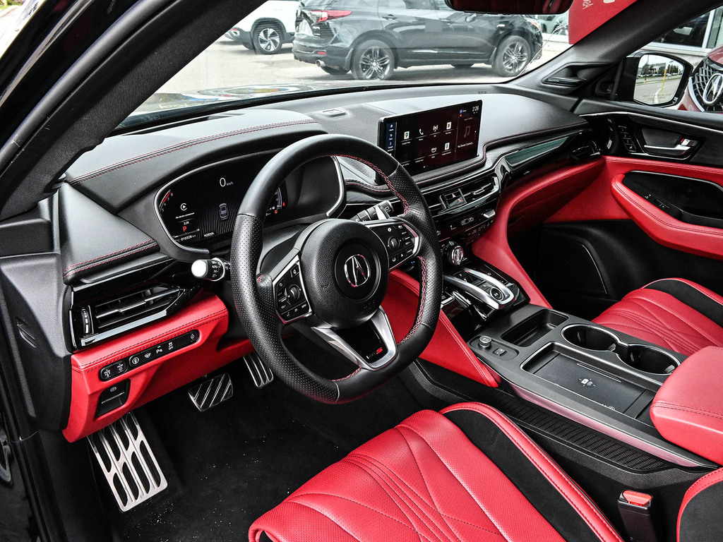 2025 Acura MDX Type-S Ultra. The 2025 Acura MDX Type S Ultra is a performance-oriented luxury SUV featuring a 3.0-liter turbocharged V6 engine with 355 horsepower and 354 lb-ft of torque. Key features include a 10-speed automatic transmission, Super Handling All-Wheel Drive (SH-AWD), an Adaptive Air Suspension, and Brembo brakes. The interior includes a 31-speaker Bang & Olufsen audio system, a 12.3-inch Precision Cockpit display, wireless Apple CarPlay and Android Auto, and a range of premium amenities like massaging and heated front and rear seats