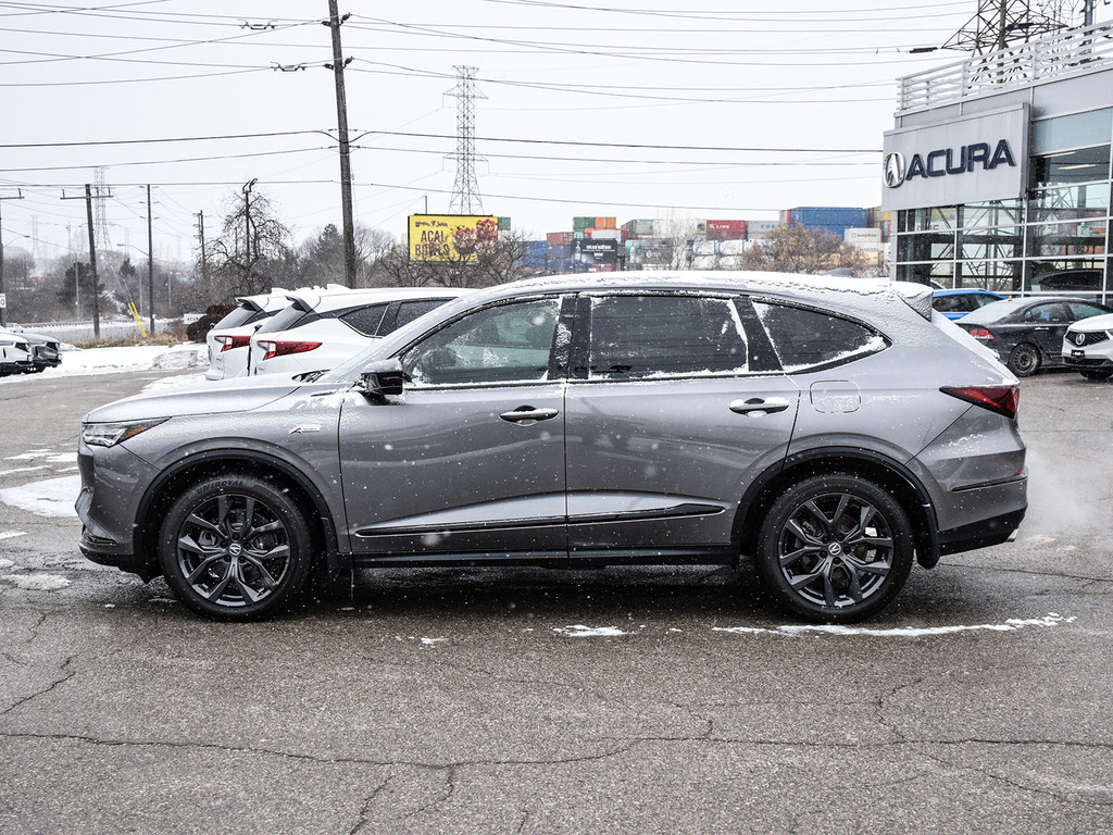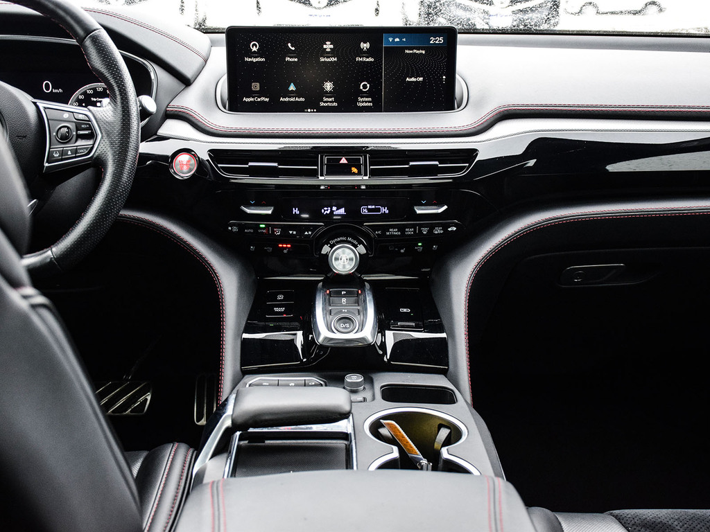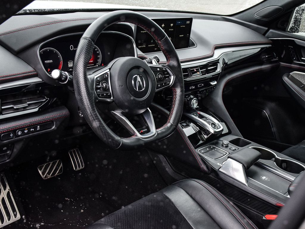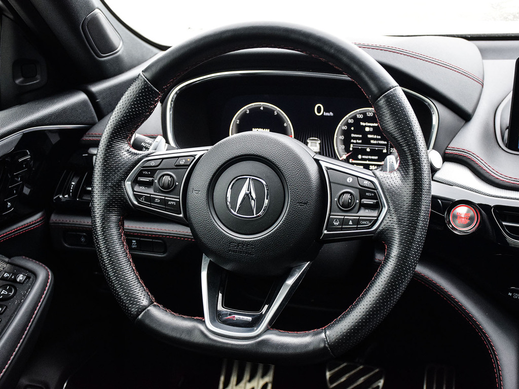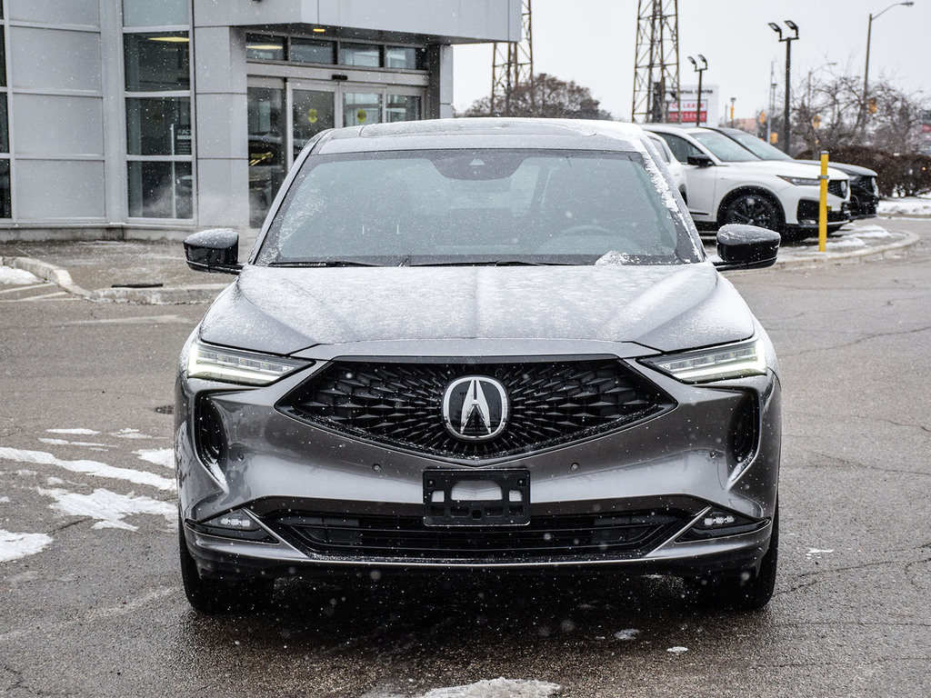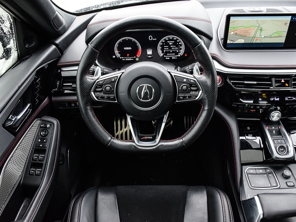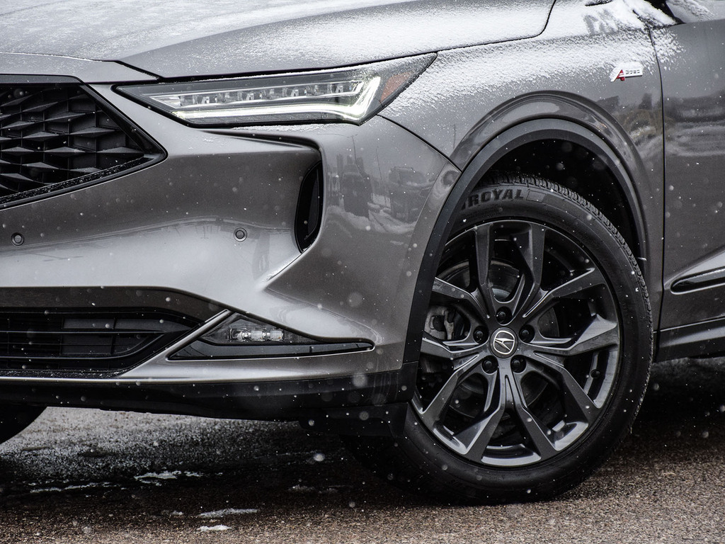 2022 Acura MDX A-spec. Acura Certified vehicle. 7 year 160,000 km warranty. The 2022 Acura MDX A-Spec is a sport-styled trim of the three-row MDX SUV, featuring a 3.5-liter V6 engine producing 290 horsepower and 267 lb-ft of torque. It comes standard with Super Handling All-Wheel Drive (SH-AWD), a 10-speed automatic transmission, and a sport-oriented design with gloss black accents, unique wheels, and an A-Spec badge. The interior is distinguished by leather and suede upholstery with red contrast stitching, a flat-bottom steering wheel, and the ELS Studio 3D premium audio system