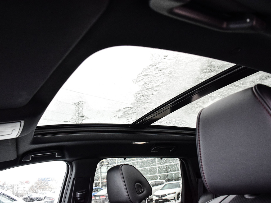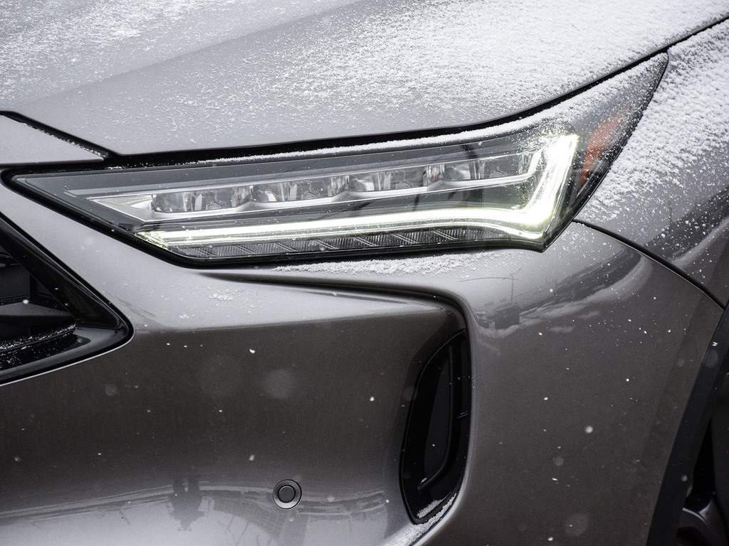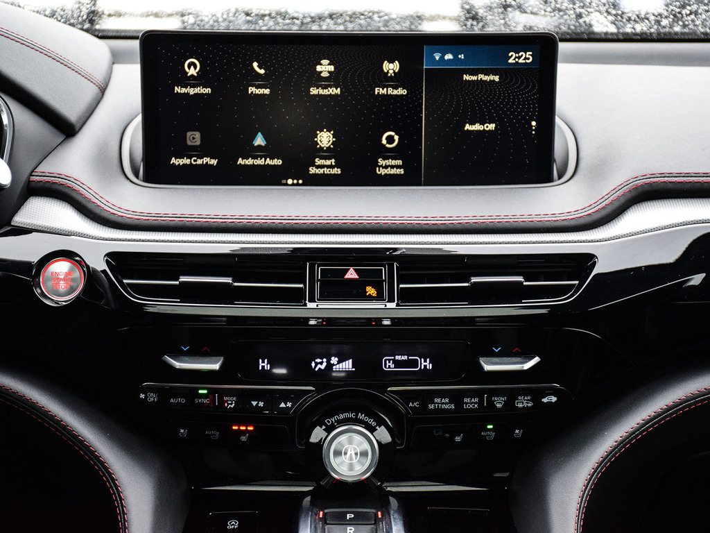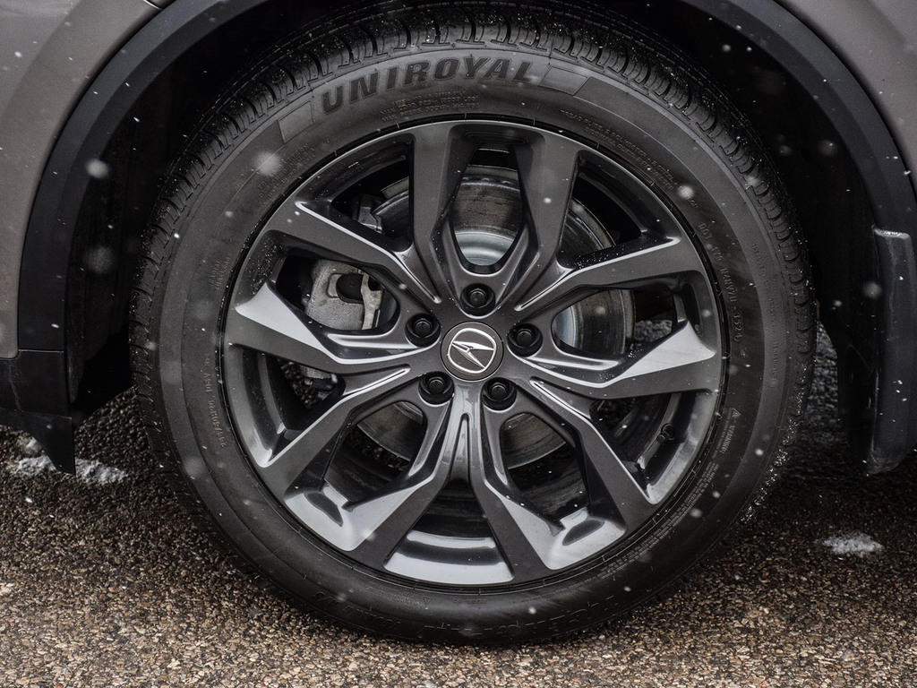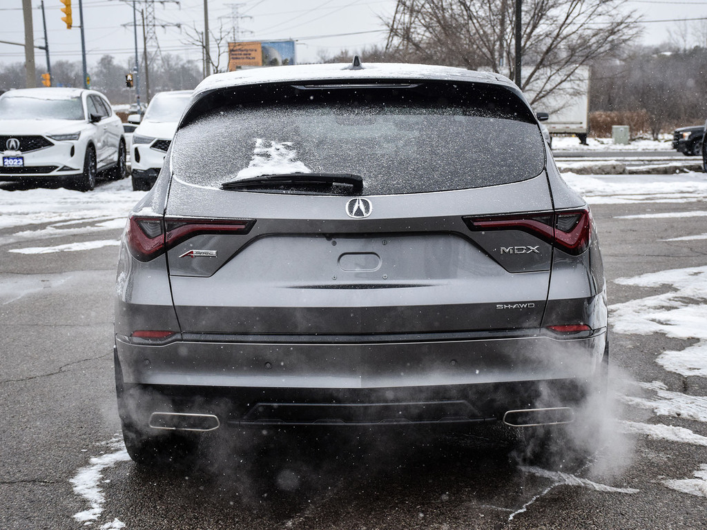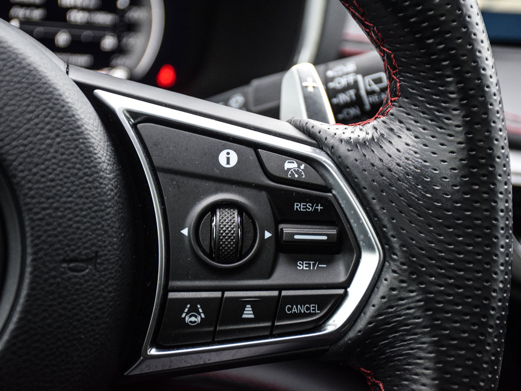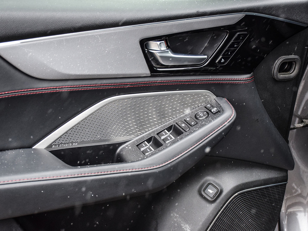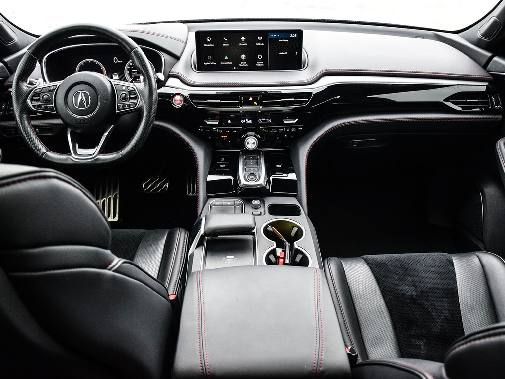2022 Acura MDX A-spec. Acura Certified vehicle. 7 year 160,000 km warranty. The 2022 Acura MDX A-Spec is a sport-styled trim of the three-row MDX SUV, featuring a 3.5-liter V6 engine producing 290 horsepower and 267 lb-ft of torque. It comes standard with Super Handling All-Wheel Drive (SH-AWD), a 10-speed automatic transmission, and a sport-oriented design with gloss black accents, unique wheels, and an A-Spec badge. The interior is distinguished by leather and suede upholstery with red contrast stitching, a flat-bottom steering wheel, and the ELS Studio 3D premium audio system
