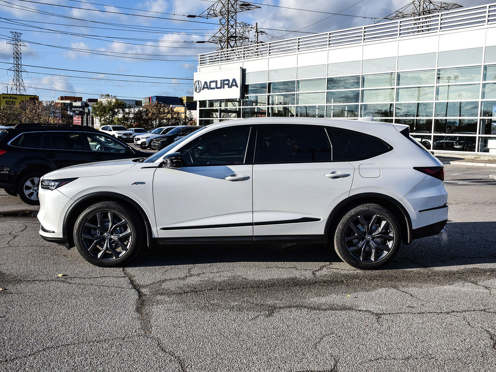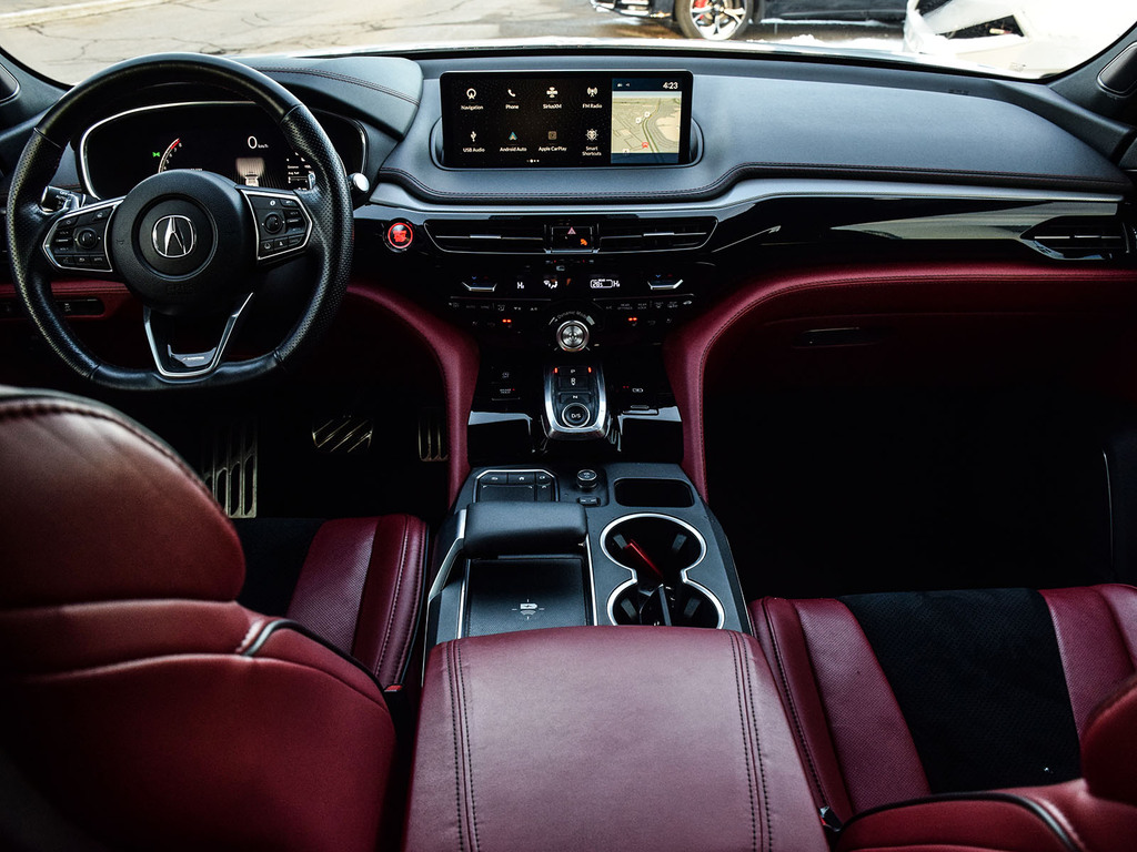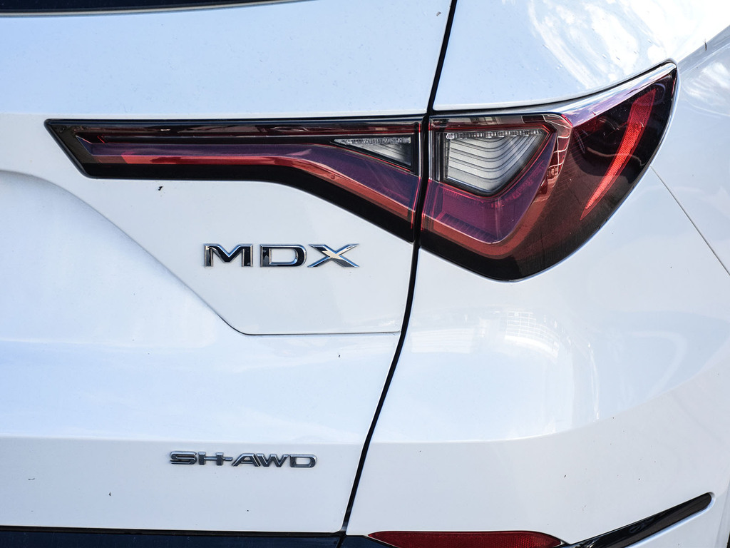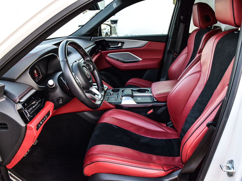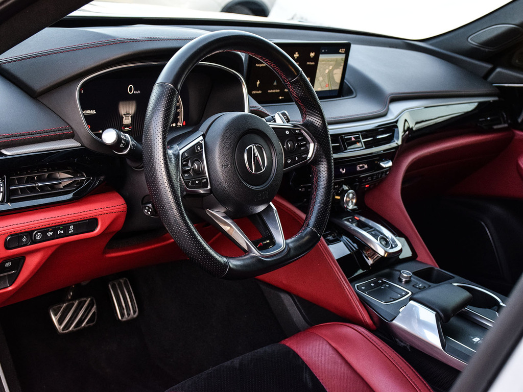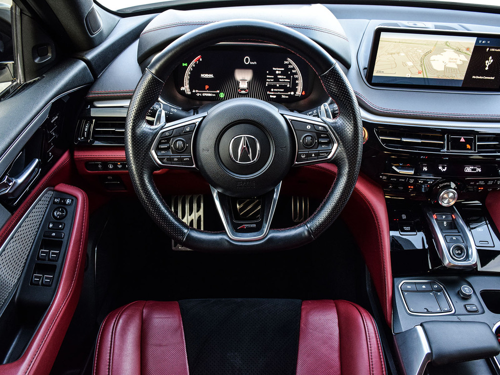 2022 Acura MDX A-spec. Acura Certified vehicle. 7 year 160,000 km warranty. The 2022 Acura MDX A-Spec is a sport-styled trim of the three-row MDX SUV, featuring a 3.5-liter V6 engine producing 290 horsepower and 267 lb-ft of torque. It comes standard with Super Handling All-Wheel Drive (SH-AWD), a 10-speed automatic transmission, and a sport-oriented design with gloss black accents, unique wheels, and an A-Spec badge. The interior is distinguished by leather and suede upholstery with red contrast stitching, a flat-bottom steering wheel, and the ELS Studio 3D premium audio system