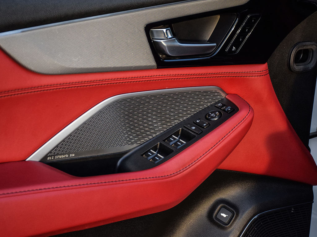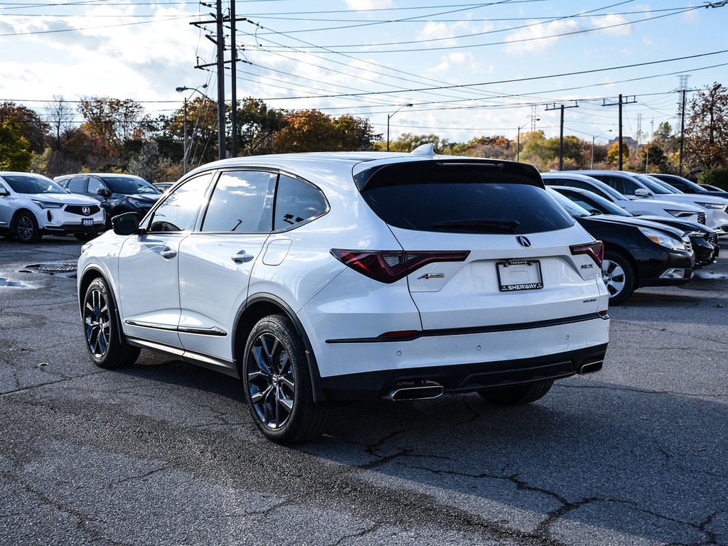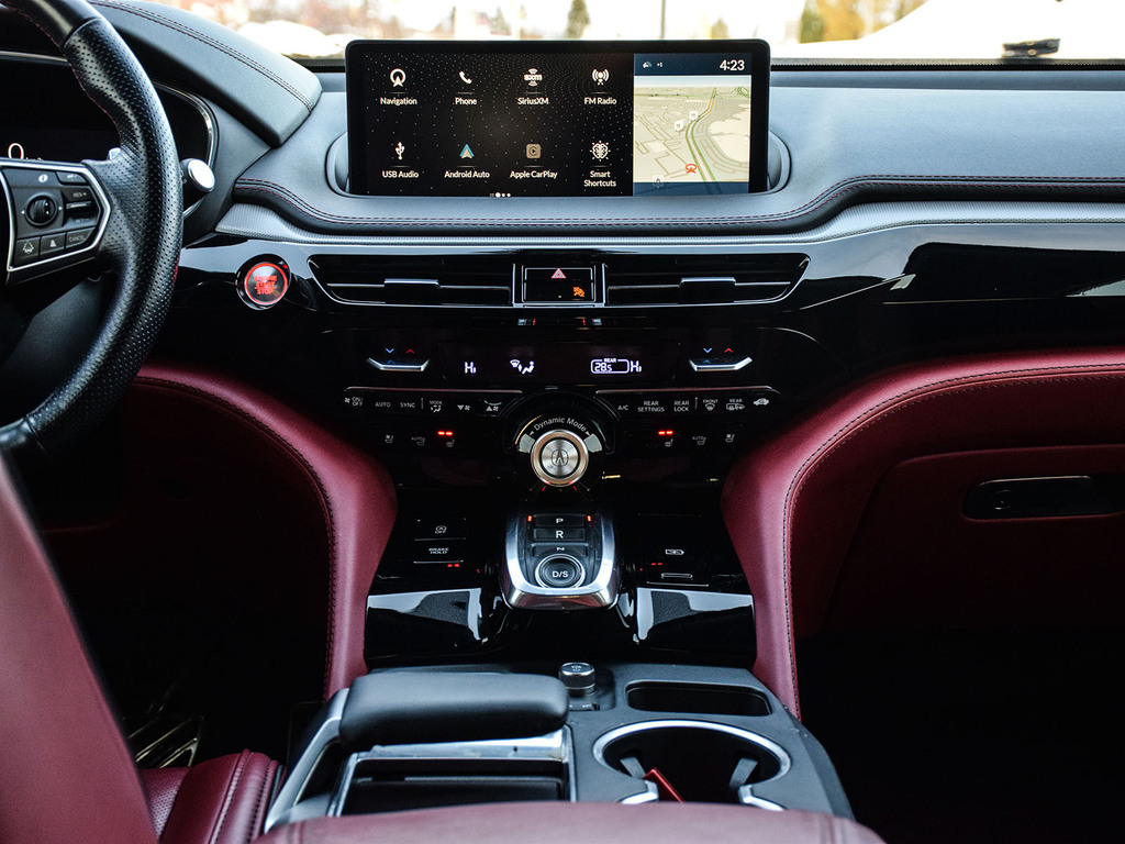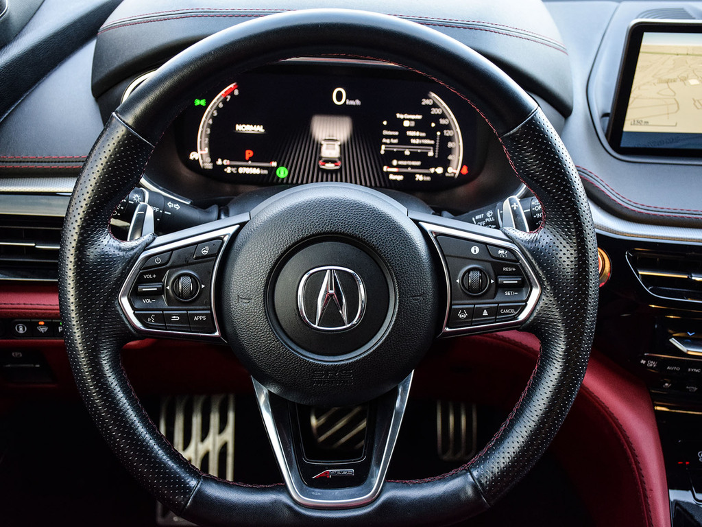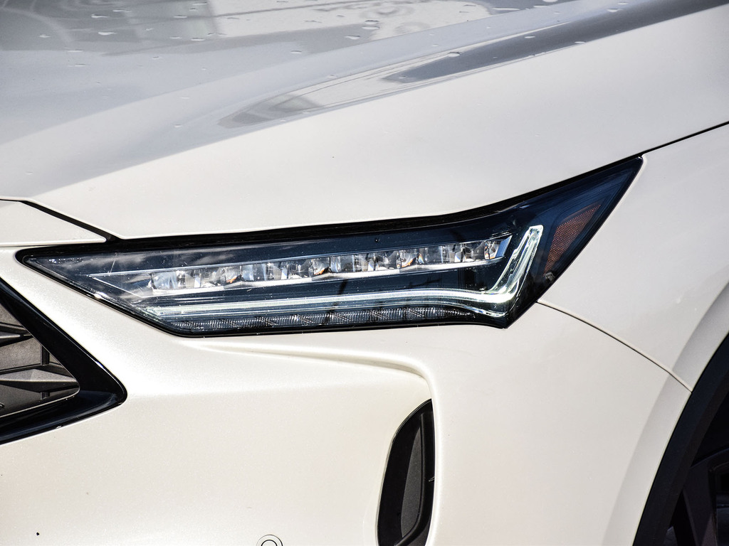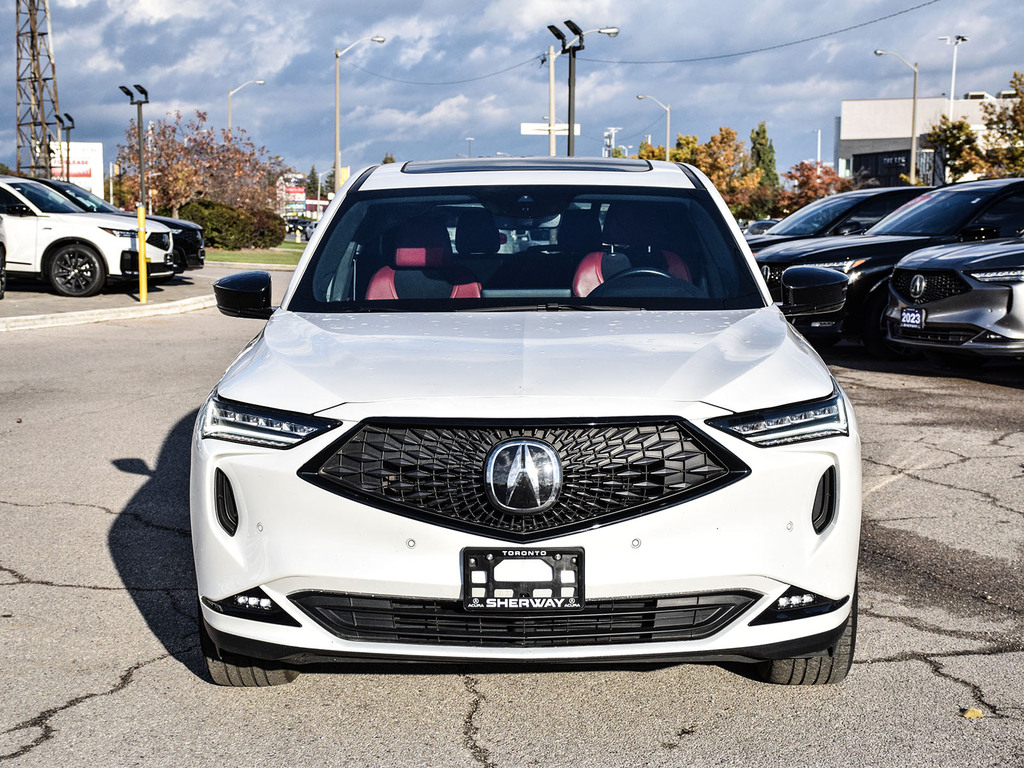 2022 Acura MDX A-spec. Acura Certified vehicle. 7 year 160,000 km warranty. The 2022 Acura MDX A-Spec is a sport-styled trim of the three-row MDX SUV, featuring a 3.5-liter V6 engine producing 290 horsepower and 267 lb-ft of torque. It comes standard with Super Handling All-Wheel Drive (SH-AWD), a 10-speed automatic transmission, and a sport-oriented design with gloss black accents, unique wheels, and an A-Spec badge. The interior is distinguished by leather and suede upholstery with red contrast stitching, a flat-bottom steering wheel, and the ELS Studio 3D premium audio system