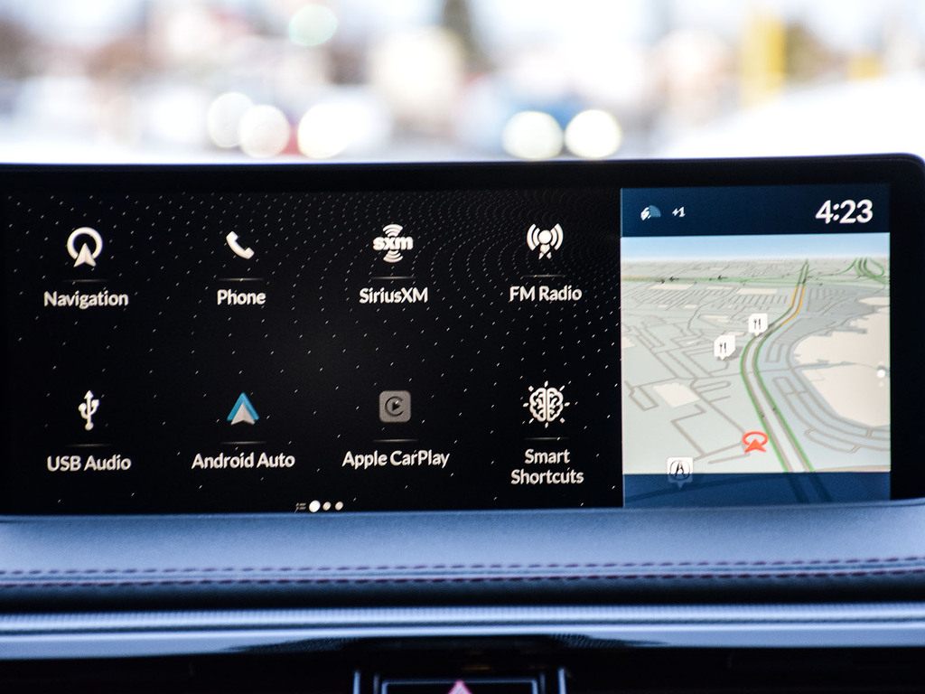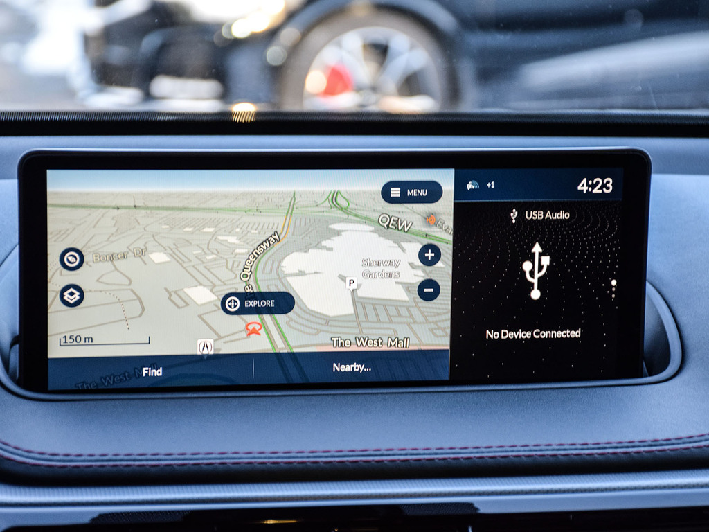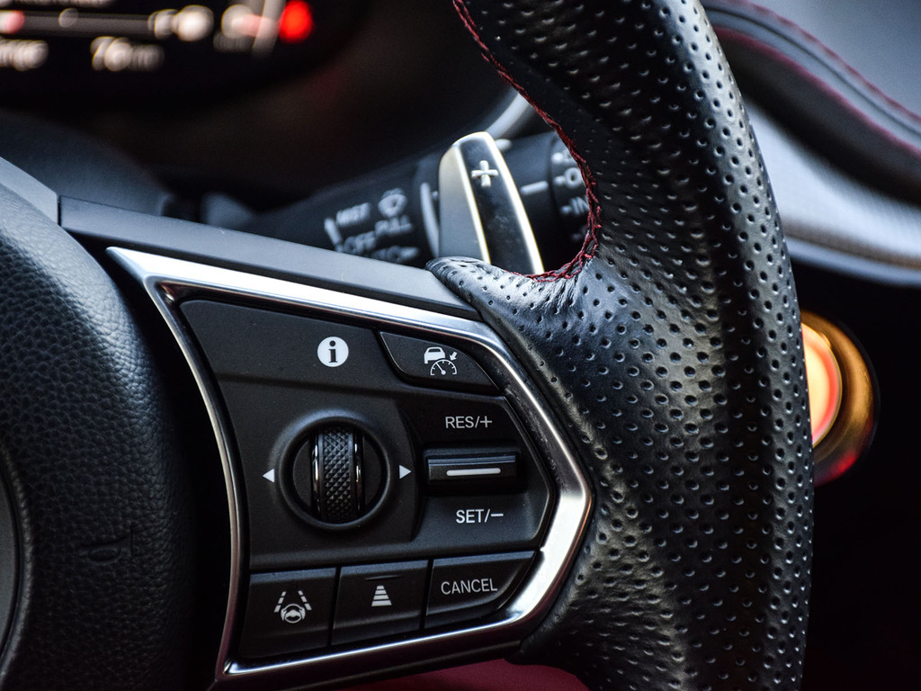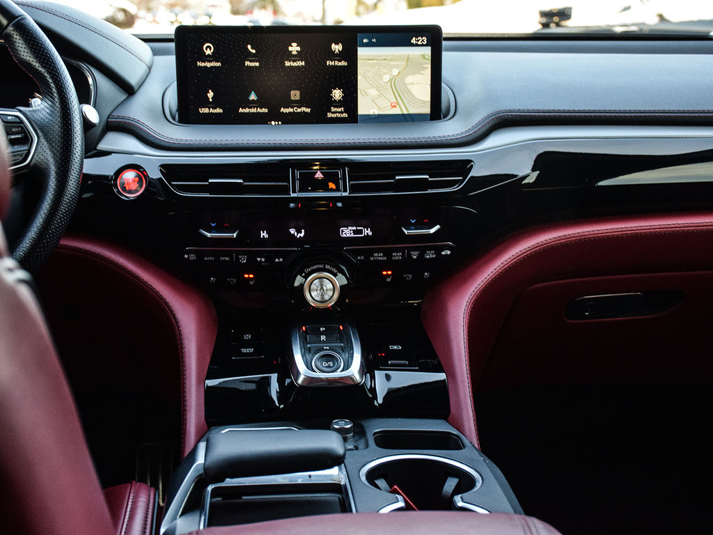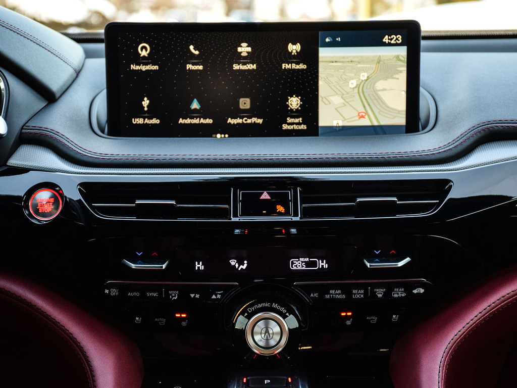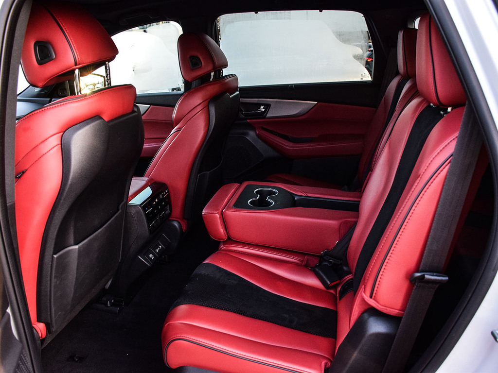 2022 Acura MDX A-spec. Acura Certified vehicle. 7 year 160,000 km warranty. The 2022 Acura MDX A-Spec is a sport-styled trim of the three-row MDX SUV, featuring a 3.5-liter V6 engine producing 290 horsepower and 267 lb-ft of torque. It comes standard with Super Handling All-Wheel Drive (SH-AWD), a 10-speed automatic transmission, and a sport-oriented design with gloss black accents, unique wheels, and an A-Spec badge. The interior is distinguished by leather and suede upholstery with red contrast stitching, a flat-bottom steering wheel, and the ELS Studio 3D premium audio system